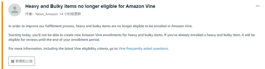 亞馬遜Vine計劃向來都是賣家獲得合規評價的重要方式。很有可能亞馬遜因為物流原因,重型大件商品已無法再注冊參加Vine計劃。