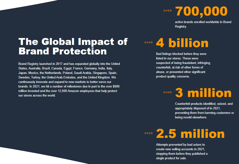此外,亞馬遜還阻攔了40億條異常商品listing的上架,清除了超出300萬件假冒商品。這種情形降低了亞馬遜2021年的知識產權侵權投訴量(較2020年降低了25%),同時使網站上的活躍品牌數量穩步增多(目前超70萬個活躍品牌,比去年增多了40%)。