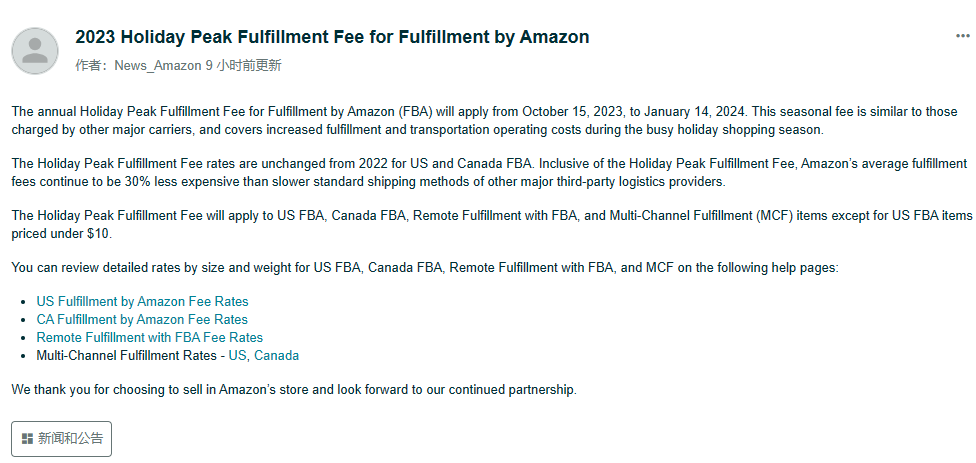 在站點方面,亞馬遜表明美國和加拿大FBA的假日高峰配送費率將與2022年的費率一樣。